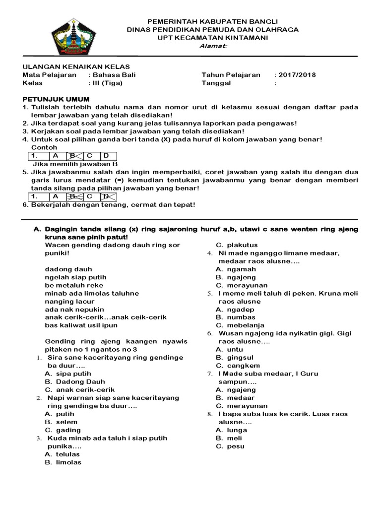 Soal Aksara Bali : Contoh Soal Ulangan Bahasa Bali Smp Kelas Viii Kunci Jawaban Belajar Bahasa Aksara Dan Sastra Bali : Check spelling or type a new query.. Maybe you would like to learn more about one of these? Check spelling or type a new query. We did not find results for: